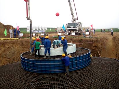 我公司承担了该风电场的土����� �������Ƴ������������ �������Ƴ����������� �������Ƴ������������ �������Ƴ������建工程及接地,施工内容主要包括风电机组����� �������Ƴ������������ �������Ƴ������������ �������Ƴ������������ �������Ƴ�������基础33座、变压器基础33座����� �������Ƴ������������ �������Ƴ������������ �������Ƴ����������� �������Ƴ�������,共完成土石方开挖与回填40112����� �������Ƴ������������ �������Ƴ������������ �������Ƴ����������� �������Ƴ�������m3,完成混凝土12578m³。