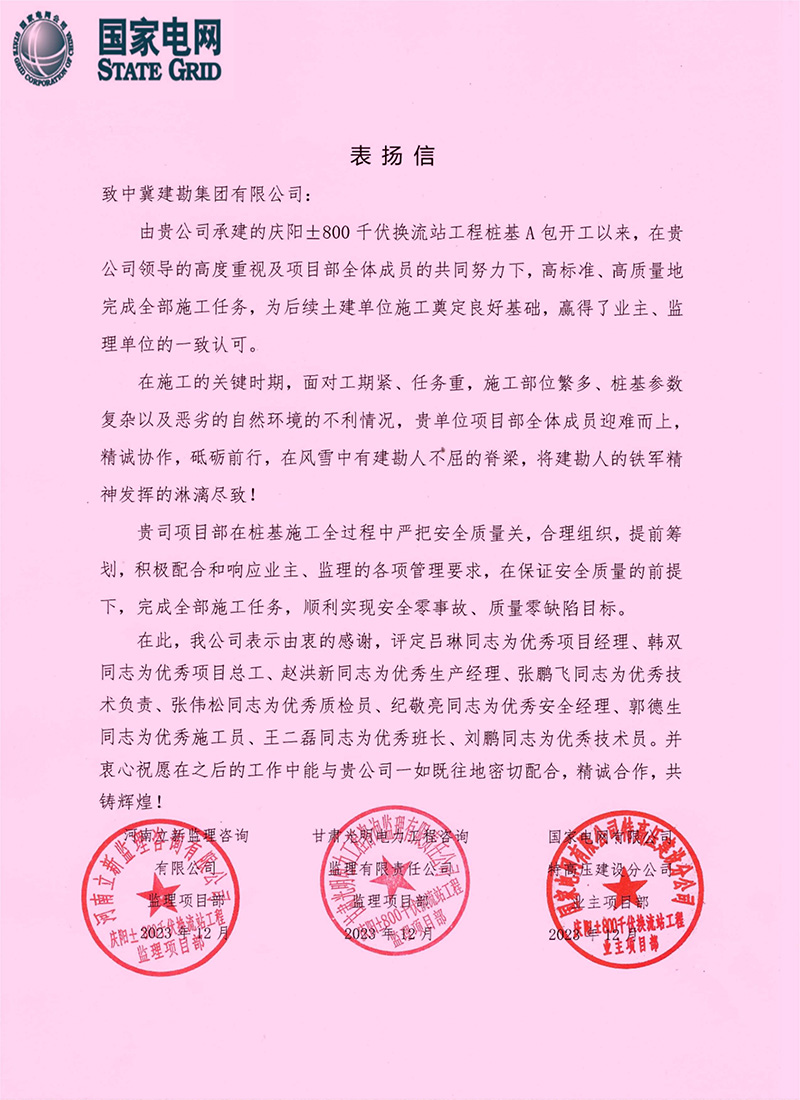 公司收到了国家电网庆阳&plu����� �������Ƴ����������� �������Ƴ������������ �������Ƴ����������� �������Ƴ�������smn;800千伏换流站工程由业主����� �������Ƴ������������ �������Ƴ������������ �������Ƴ������������ �������Ƴ�������国家电网和监理单位河南立新及甘肃光明的����� �������Ƴ������������ �������Ƴ������������ �������Ƴ������������ �������Ƴ�������联合表扬信,表扬信中说在我公司����� �������Ƴ������������ �������Ƴ������������ �������Ƴ������������ �������Ƴ�������领导的高度重视及项目部全体成员的共同努����� �������Ƴ������������ �������Ƴ������������ �������Ƴ������������ �������Ƴ�������力下,高标准、高质量地完成施工任务,为后续土建����� �������Ƴ������������ �������Ƴ������������ �������Ƴ������������ �������Ƴ�������单位施工奠定良好基础,赢得了业主、����� �������Ƴ������������ �������Ƴ������������ �������Ƴ������������ �������Ƴ�������监理单位的一致认可。在施����� �������Ƴ������������ �������Ƴ������������ �������Ƴ������������ �������Ƴ�������工的关键时期,我单位项目部全����� �������Ƴ����������� �������Ƴ������������ �������Ƴ������������ �������Ƴ�������体成员迎难而上,精诚协作,砥砺前行,在风����� �������Ƴ������������ �������Ƴ������������ �������Ƴ������������ �������Ƴ�������雪中有建勘人不屈的脊梁,将建勘����� �������Ƴ����������� �������Ƴ������������ �������Ƴ������������ �������Ƴ�������人的铁军精神发挥的淋漓尽致!����� �������Ƴ������������ �������Ƴ������������ �������Ƴ������������ �������Ƴ������