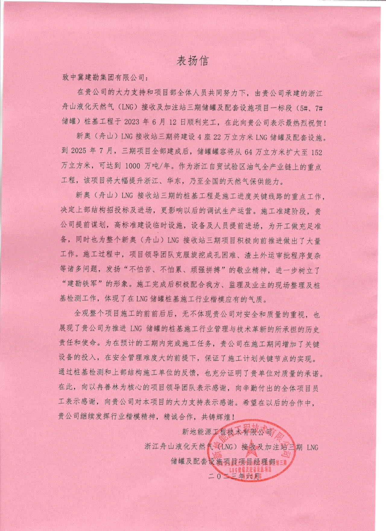 &����� �������Ƴ������������ �������Ƴ����������� �������Ƴ������������ �������Ƴ�������nbsp;浙江舟山液化天然气(����� �������Ƴ������������ �������Ƴ������������ �������Ƴ������������ �������Ƴ�������LNG)接收及加注站三期L����� �������Ƴ������������ �������Ƴ������������ �������Ƴ������������ �������Ƴ�������NG储罐及配套设施项目(5#、7#储罐����� �������Ƴ����������� �������Ƴ������������ �������Ƴ������������ �������Ƴ�������桩基工程)于2023年6月25日收到新地����� �������Ƴ������������ �������Ƴ������������ �������Ƴ������������ �������Ƴ�������能源工程技术有限公司发来的表扬信。自开工����� �������Ƴ������������ �������Ƴ������������ �������Ƴ������������ �������Ƴ�������以来,在公司的大力支持和项目部全体����� �������Ƴ������������ �������Ƴ����������� �������Ƴ����������� �������Ƴ�������员工的共同努力下,精心组织、全力布局,克服����� �������Ƴ����������� �������Ƴ������������ �������Ƴ������������ �������Ƴ�������了前期施工任务重等诸多困难,安全、高效、优质的����� �������Ƴ������������ �������Ƴ������������ �������Ƴ����������� �������Ƴ������完成了储罐的桩基施工任务,有力保障了本����� �������Ƴ����������� �������Ƴ������������ �������Ƴ������������ �������Ƴ�������项目总体工期计划,赢得了监理单位和业主单位的����� �������Ƴ������������ �������Ƴ����������� �������Ƴ������������ �������Ƴ������一致认可和好评。
