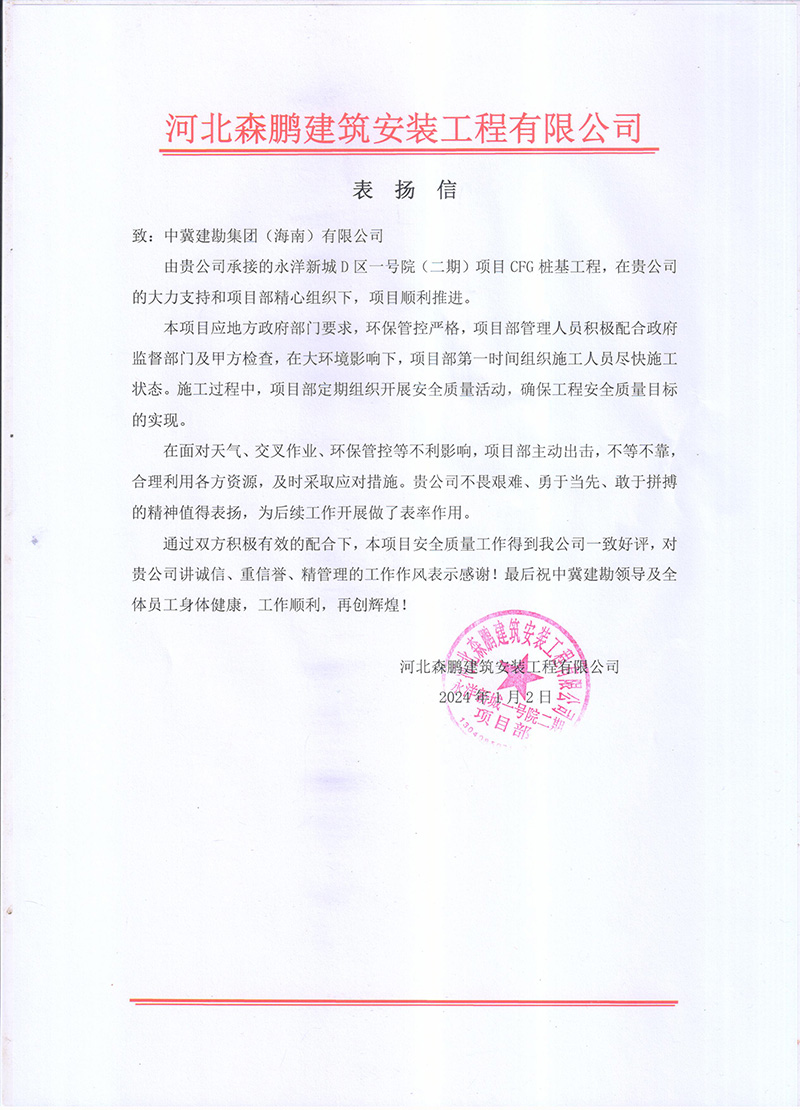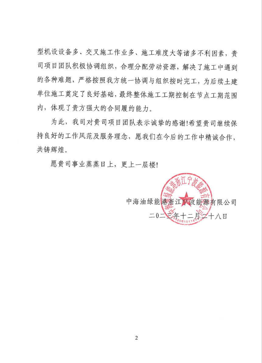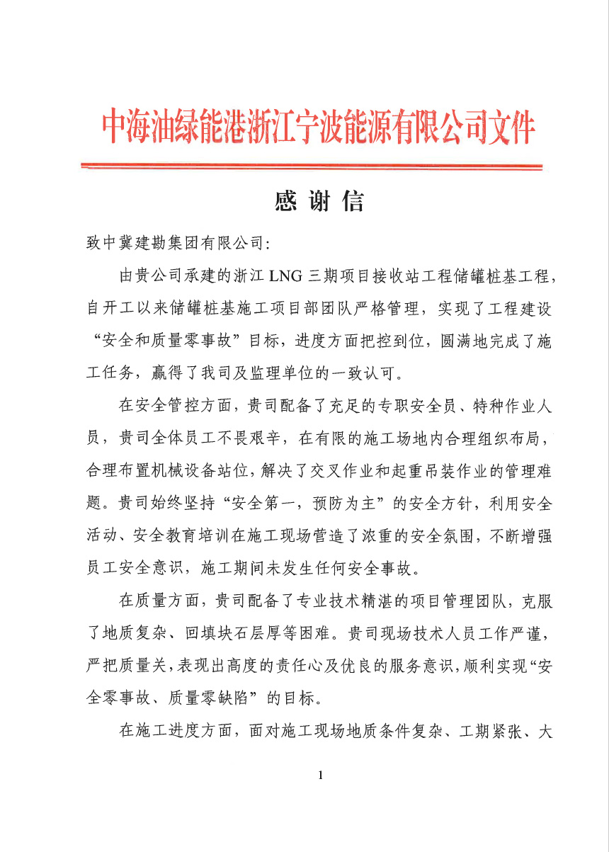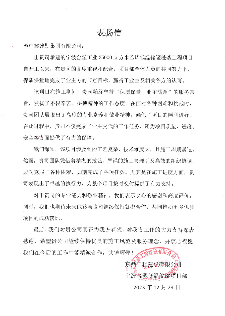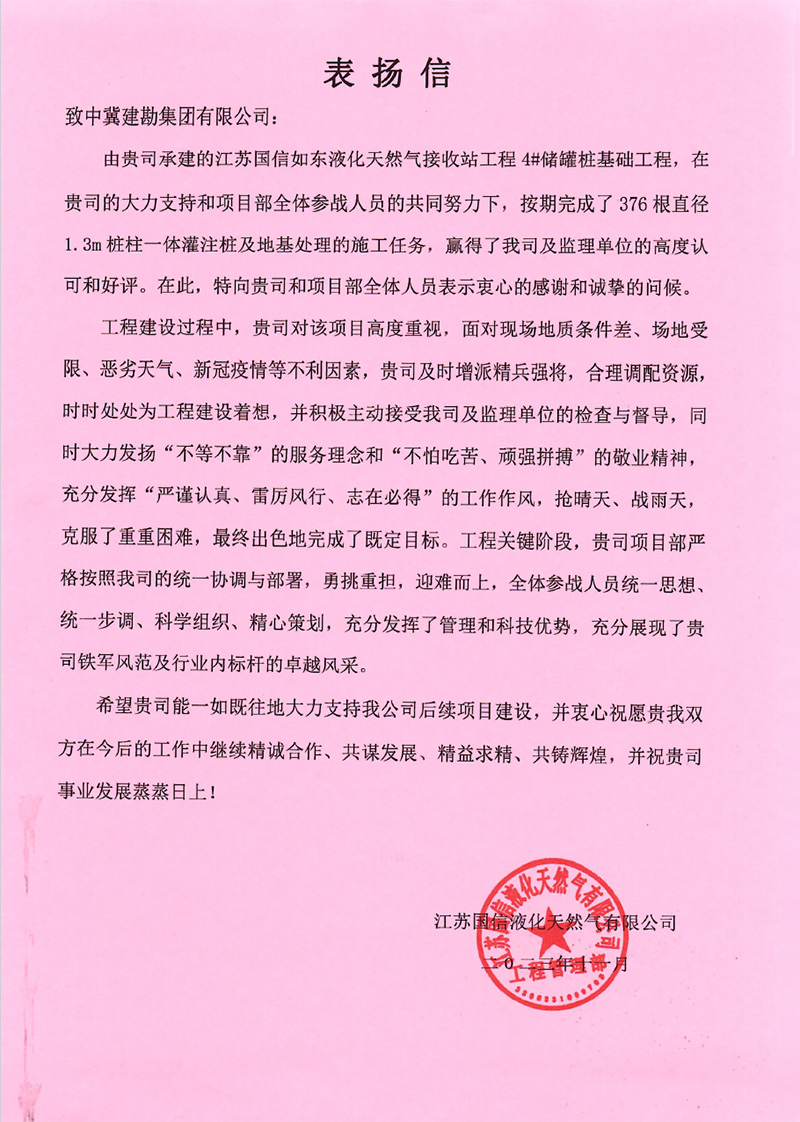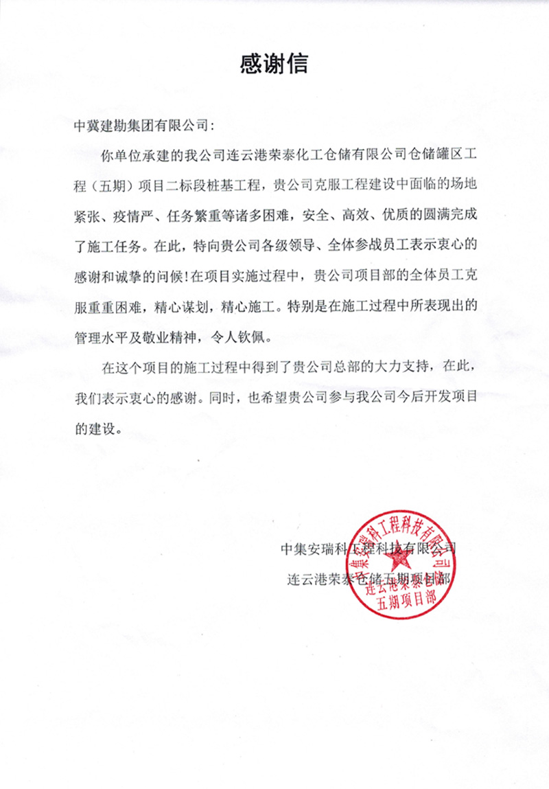 连云港荣泰化工仓储有限����� �������Ƴ������������ �������Ƴ������������ �������Ƴ������������ �������Ƴ�������公司仓储罐区工程(五期)项目二标段桩基工����� �������Ƴ������������ �������Ƴ����������� �������Ƴ������������ �������Ƴ�������程,业主在表扬信中说:贵公司克服工程建设����� �������Ƴ������������ �������Ƴ������������ �������Ƴ������������ �������Ƴ�������中面临的场地紧张、疫情严、任务繁重等诸多困难,����� �������Ƴ������������ �������Ƴ������������ �������Ƴ������������ �������Ƴ�������安全、高效、优质的圆满完成了����� �������Ƴ������������ �������Ƴ����������� �������Ƴ����������� �������Ƴ�������施工任务。贵公司项目部全体员工克����� �������Ƴ������������ �������Ƴ������������ �������Ƴ������������ �������Ƴ�������服重重困难,精心谋划,精心施工����� �������Ƴ������������ �������Ƴ������������ �������Ƴ������������ �������Ƴ�������。特别是在施工中所表现出的管理水平及敬业精神,����� �������Ƴ����������� �������Ƴ������������ �������Ƴ������������ �������Ƴ�������令人钦佩。