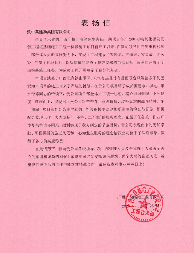&����� �������Ƴ������������ �������Ƴ������������ �������Ƴ������������ �������Ƴ������nbsp;广西北海氧化铝项目桩基工程工程自20����� �������Ƴ������������ �������Ƴ������������ �������Ƴ������������ �������Ƴ�������23年2月24日开工,至12月15日完成合����� �������Ƴ������������ �������Ƴ������������ �������Ƴ������������ �������Ƴ�������同内全部桩基施工任务,在此期间,项����� �������Ƴ������������ �������Ƴ������������ �������Ƴ������������ �������Ƴ�������目部全体成员一直坚持安全第一的理����� �������Ƴ������������ �������Ƴ����������� �������Ƴ������������ �������Ƴ�������念,实现了工程建设“零缺陷、零����� �������Ƴ������������ �������Ƴ������������ �������Ƴ������������ �������Ƴ������伤害、零事故、零污染”的安全管����� �������Ƴ������������ �������Ƴ����������� �������Ƴ����������� �������Ƴ�������理目标,施工过程中克服种种困难,顺利实现����� �������Ƴ������������ �������Ƴ����������� �������Ƴ������������ �������Ƴ�������了业主方制定的节点目标,获得业主单����� �������Ƴ������������ �������Ƴ������������ �������Ƴ������������ �������Ƴ�������位的肯定与褒奖,送出表扬信,为����� �������Ƴ������������ �������Ƴ������������ �������Ƴ������������ �������Ƴ������主要管理人员颁发奖状。为后续����� �������Ƴ������������ �������Ƴ������������ �������Ƴ������������ �������Ƴ�������施工工作的开展提供了可靠保障,赢得了业����� �������Ƴ������������ �������Ƴ������������ �������Ƴ������������ �������Ƴ�������主及相关各方的认可。