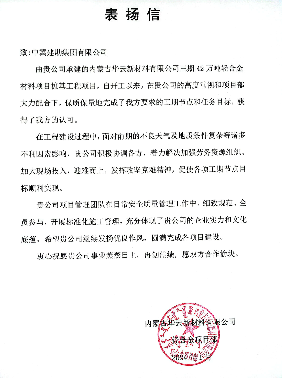 内蒙古华云新材料有限����� �������Ƴ������������ �������Ƴ������������ �������Ƴ������������ �������Ƴ�������公司三期42万吨轻合金材料项目桩基工程,在工程����� �������Ƴ������������ �������Ƴ������������ �������Ƴ������������ �������Ƴ�������建设过程中,面对前期的不良天气及����� �������Ƴ����������� �������Ƴ������������ �������Ƴ������������ �������Ƴ�������地质条件复杂等诸多不利因素影响����� �������Ƴ������������ �������Ƴ������������ �������Ƴ������������ �������Ƴ�������,积极协调各方,着力解决����� �������Ƴ����������� �������Ƴ������������ �������Ƴ������������ �������Ƴ�������加强劳务资源组织、加大现场投入,迎难而上,发挥����� �������Ƴ����������� �������Ƴ������������ �������Ƴ������������ �������Ƴ�������攻坚克难精神,保质保量地完����� �������Ƴ������������ �������Ƴ������������ �������Ƴ������������ �������Ƴ������成了工期节点和任务目标,获得甲方的认可����� �������Ƴ����������� �������Ƴ����������� �������Ƴ������������ �������Ƴ�������。
