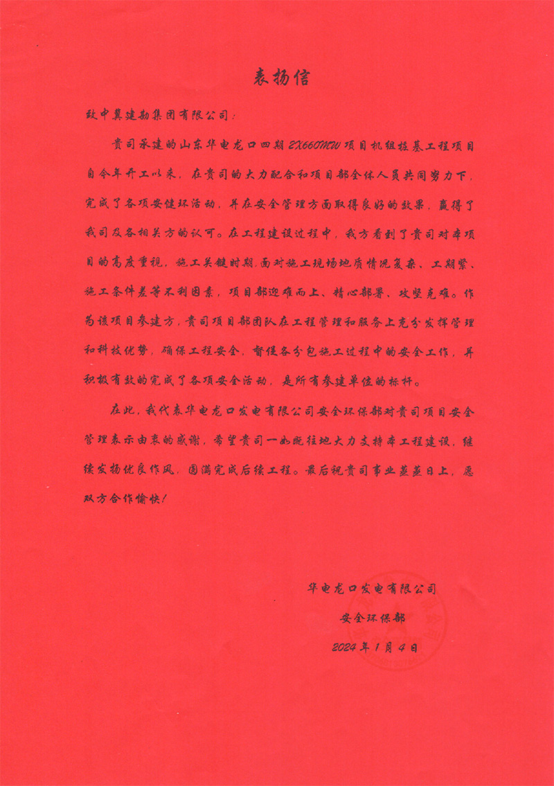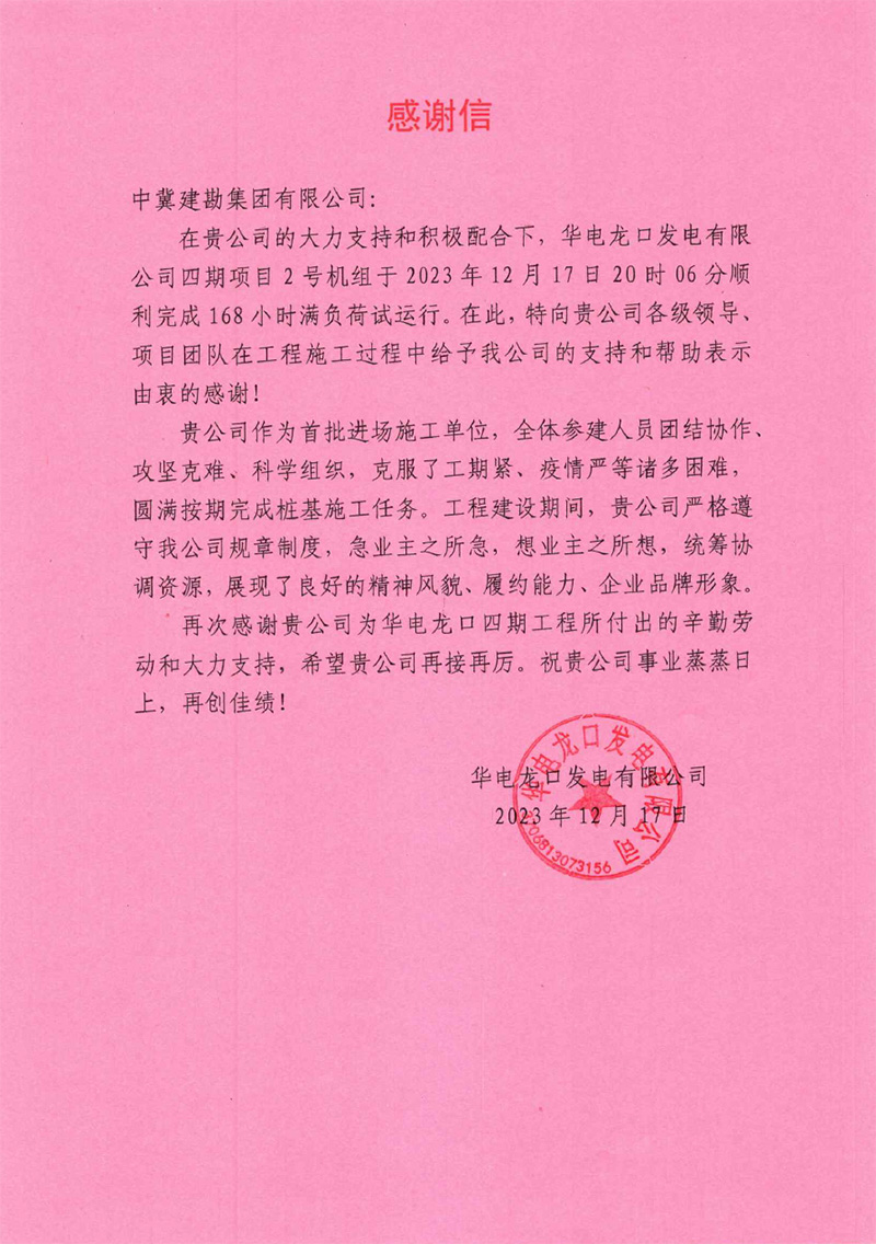 华电龙口发电有限公司四期项目2����� �������Ƴ������������ �������Ƴ����������� �������Ƴ������������ �������Ƴ�������号机组于2023年12月17日20时04分顺����� �������Ƴ������������ �������Ƴ������������ �������Ƴ������������ �������Ƴ�������利完成168小时满负荷试运����� �������Ƴ������������ �������Ƴ������������ �������Ƴ������������ �������Ƴ�������行。工程建设期间,完成了各项安健环活动,����� �������Ƴ����������� �������Ƴ������������ �������Ƴ������������ �������Ƴ�������并在安全管理方面取得良好的����� �������Ƴ������������ �������Ƴ����������� �������Ƴ������������ �������Ƴ�������效果,赢得了业主方认可。我公司人员严����� �������Ƴ������������ �������Ƴ������������ �������Ƴ������������ �������Ƴ�������格遵守我公司规章制度,急业主之所急,想业主之所想����� �������Ƴ������������ �������Ƴ������������ �������Ƴ������������ �������Ƴ�������,统筹协调资源,展现了良好的精神风貌、履����� �������Ƴ������������ �������Ƴ������������ �������Ƴ������������ �������Ƴ�������约能力、企业品牌形象。为此,业主特向����� �������Ƴ������������ �������Ƴ������������ �������Ƴ������������ �������Ƴ�������我公司各级领导、项目团队在工程施工过程中给����� �������Ƴ������������ �������Ƴ������������ �������Ƴ������������ �������Ƴ�������予的支持和帮助表示由衷感谢。