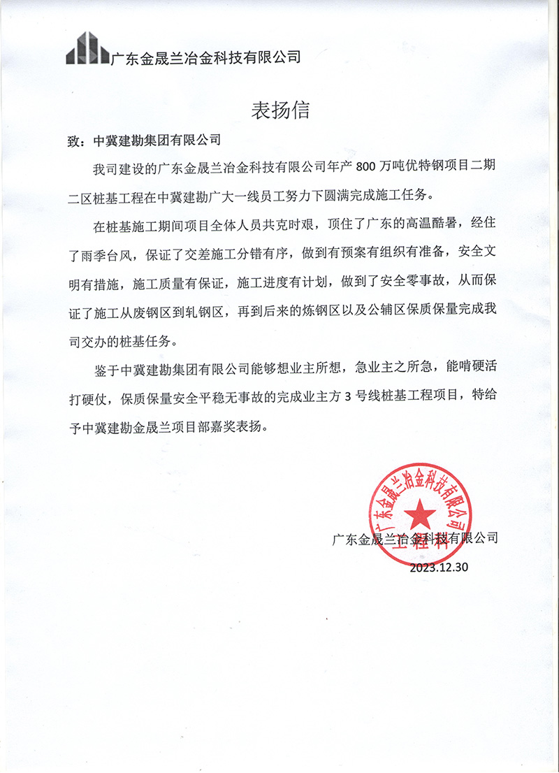 广东金盛兰冶金科技有限公司年产800����� �������Ƴ������������ �������Ƴ������������ �������Ƴ������������ �������Ƴ�������万吨优特钢项目二期二区桩基工����� �������Ƴ������������ �������Ƴ������������ �������Ƴ������������ �������Ƴ�������程,在施工期间项目全体人员共克时艰,顶住了广����� �������Ƴ����������� �������Ƴ������������ �������Ƴ������������ �������Ƴ�������东的高温酷暑,经住了雨季台风,保证了����� �������Ƴ������������ �������Ƴ������������ �������Ƴ������������ �������Ƴ�������交差施工分错有序,做到了预案有组织����� �������Ƴ������������ �������Ƴ������������ �������Ƴ������������ �������Ƴ�������有准备,安全文明有措施,施工质量有保证����� �������Ƴ������������ �������Ƴ������������ �������Ƴ����������� �������Ƴ�������,施工进度有计划,做到了安全零事故,保质保量的����� �������Ƴ������������ �������Ƴ������������ �������Ƴ������������ �������Ƴ�������完成任务,业主对项目给予嘉奖表扬。