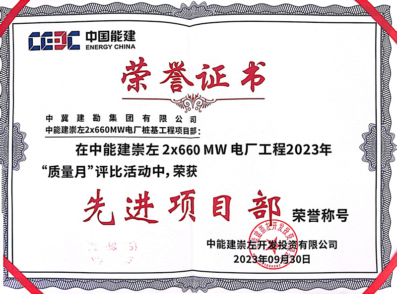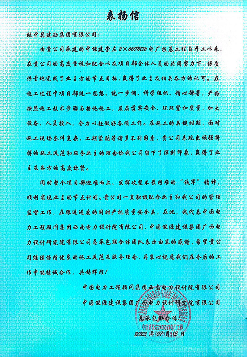 中能建崇左2×660MW����� �������Ƴ������������ �������Ƴ������������ �������Ƴ������������ �������Ƴ�������电厂桩基工程,在施工过程中,项目部统����� �������Ƴ������������ �������Ƴ������������ �������Ƴ������������ �������Ƴ�������一思想、统一步调、科学组织,����� �������Ƴ������������ �������Ƴ������������ �������Ƴ������������ �������Ƴ������精心部署,严格按照施工技����� �������Ƴ������������ �������Ƴ������������ �������Ƴ������������ �������Ƴ�������术步骤与措施施工,层层落����� �������Ƴ������������ �������Ƴ����������� �������Ƴ������������ �������Ƴ�������实安全,环环紧扣质量,加大设备、人员投入,����� �������Ƴ������������ �������Ƴ������������ �������Ƴ������������ �������Ƴ�������全力以赴做好各项工作。全����� �������Ƴ������������ �������Ƴ������������ �������Ƴ������������ �������Ƴ�������体员工以顽强拼搏的施工风范和����� �������Ƴ������������ �������Ƴ������������ �������Ƴ������������ �������Ƴ�������服务业主的理念给我公司留下了深刻印象,赢得了����� �������Ƴ������������ �������Ƴ������������ �������Ƴ������������ �������Ƴ������业主及各方的高度称赞。