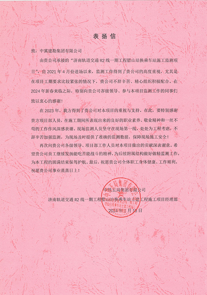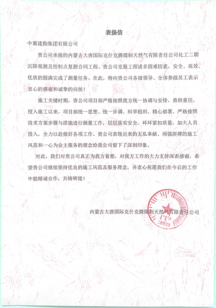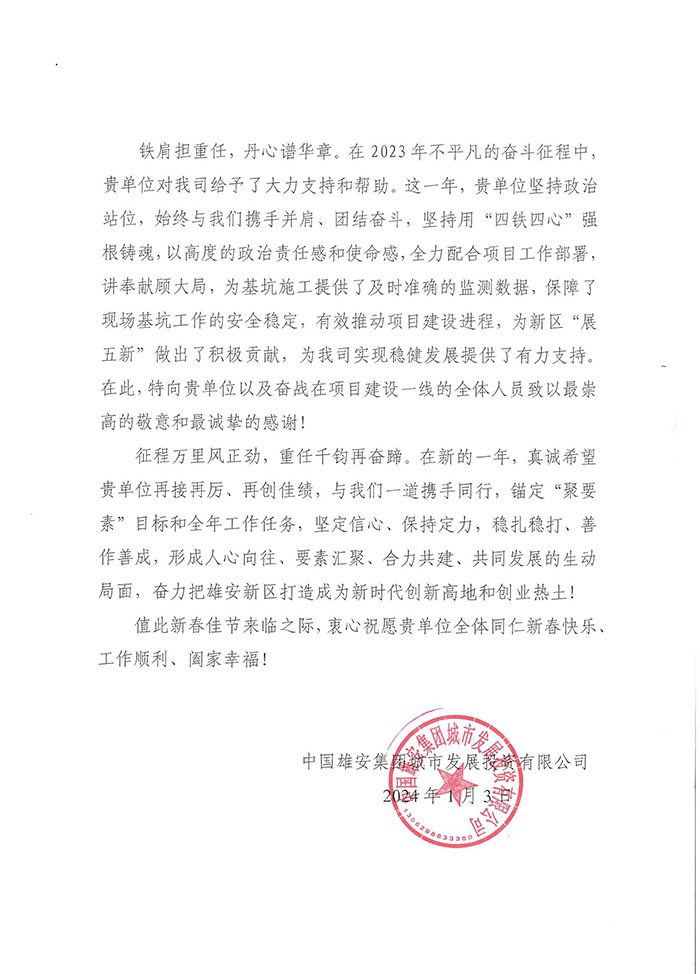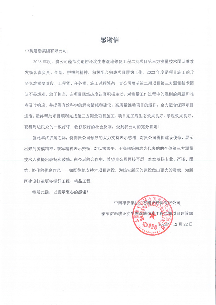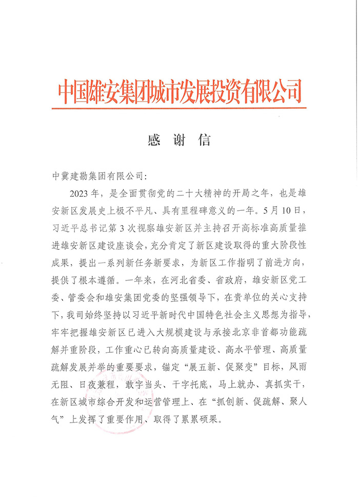 近期,公司陆续收到中����� �������Ƴ������������ �������Ƴ������������ �������Ƴ����������� �������Ƴ�������国雄安集团城市发展投资有限公����� �������Ƴ������������ �������Ƴ������������ �������Ƴ������������ �������Ƴ������司、河北雄安轨道快线有限责任公司、中国雄安集团生����� �������Ƴ������������ �������Ƴ������������ �������Ƴ������������ �������Ƴ�������态建设投资有限公司、中铁五局、����� �������Ƴ������������ �������Ƴ������������ �������Ƴ������������ �������Ƴ�������中铁十七局、郑州地铁集团、内蒙����� �������Ƴ������������ �������Ƴ������������ �������Ƴ������������ �������Ƴ�������古大唐国际克什克腾旗煤制天然气����� �������Ƴ����������� �������Ƴ����������� �������Ƴ������������ �������Ƴ�������电厂、大唐内蒙古多伦电厂等业主单位发����� �������Ƴ����������� �������Ƴ������������ �������Ƴ������������ �������Ƴ�������来的感谢信。我公司认真负责����� �������Ƴ������������ �������Ƴ������������ �������Ƴ����������� �������Ƴ�������、敢打能打硬仗的工作态度、顽强拼����� �������Ƴ����������� �������Ƴ������������ �������Ƴ������������ �������Ƴ������搏的施工风范和一心为业主服务的理念,赢得了业主的����� �������Ƴ������������ �������Ƴ������������ �������Ƴ������������ �������Ƴ�������高度认可和赞扬,特发来感谢信深����� �������Ƴ����������� �������Ƴ����������� �������Ƴ������������ �������Ƴ�������表感谢!