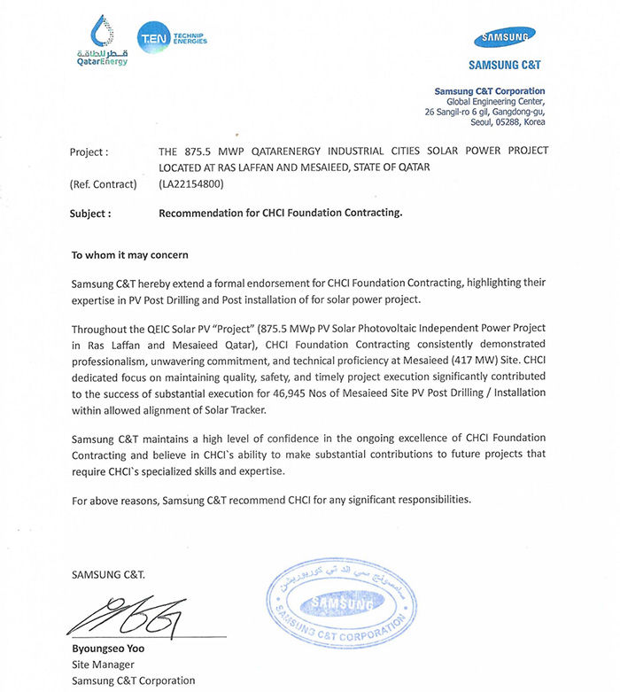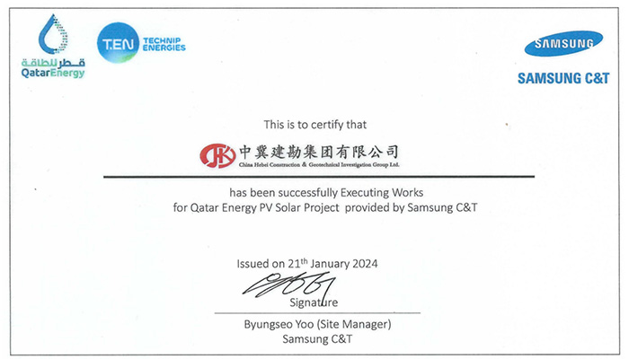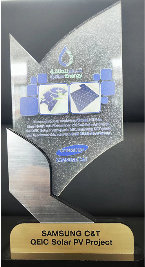 我公司收到卡塔尔能源����� �������Ƴ����������� �������Ƴ������������ �������Ƴ������������ �������Ƴ�������875.5MW光伏发电项目业主方卡塔尔能源和总����� �������Ƴ������������ �������Ƴ������������ �������Ƴ������������ �������Ƴ�������包方三星C&T公司联����� �������Ƴ������������ �������Ƴ������������ �������Ƴ������������ �������Ƴ�������合颁发的奖杯和推荐信。业主及����� �������Ƴ������������ �������Ƴ������������ �������Ƴ������������ �������Ƴ�������总包方高度认可我公司项目履约能力,赞扬我司����� �������Ƴ������������ �������Ƴ������������ �������Ƴ������������ �������Ƴ�������对该项目成功交付做出重大贡献,表示愿意与我司建����� �������Ƴ����������� �������Ƴ������������ �������Ƴ������������ �������Ƴ�������立长期合作关系。基于我司卓越的����� �������Ƴ����������� �������Ƴ������������ �������Ƴ������������ �������Ƴ�������履约表现,三星C&T����� �������Ƴ����������� �������Ƴ������������ �������Ƴ������������ �������Ƴ�������公司授予我司推荐信。
